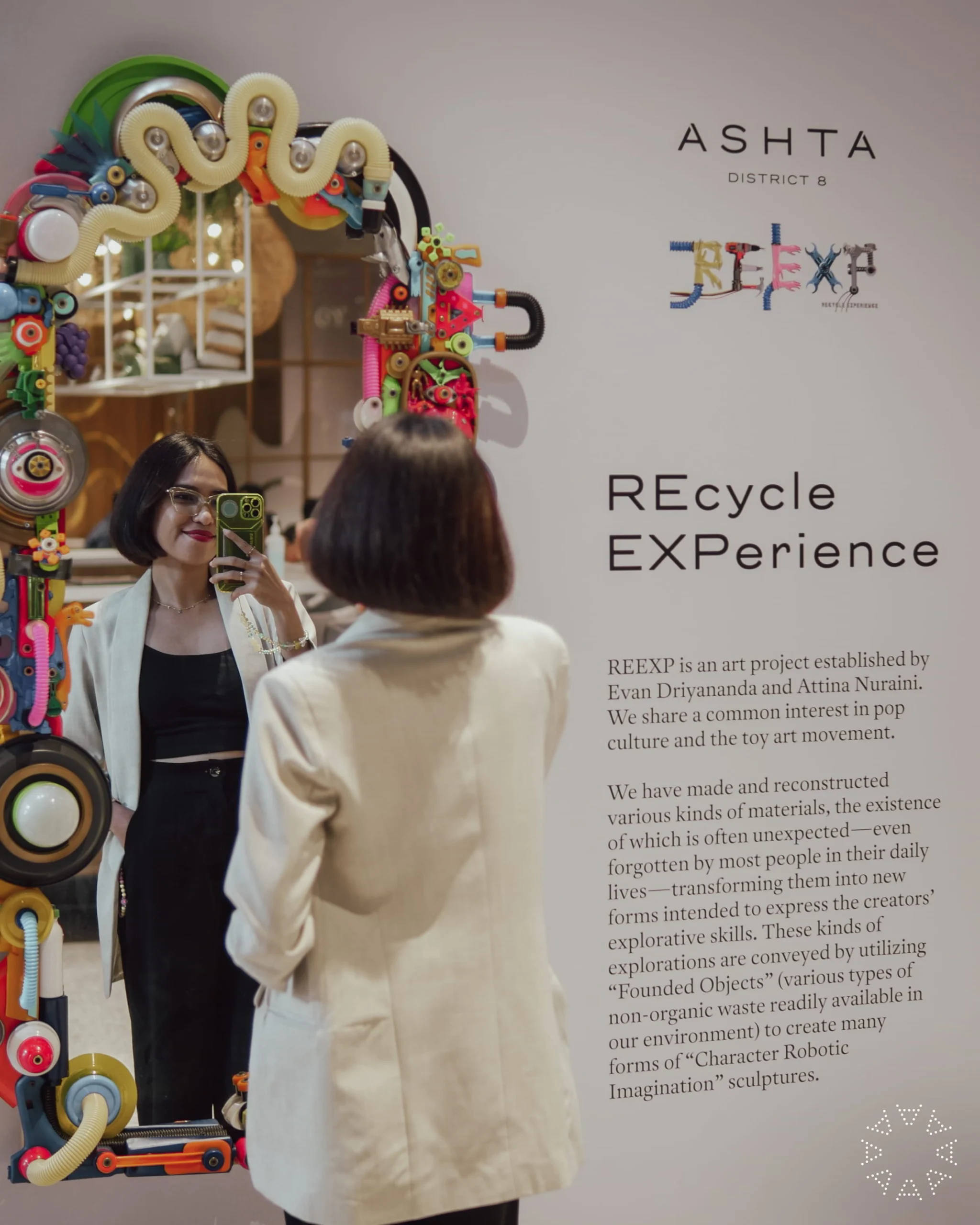 Karya ini menggambarkan “Karakter Imajinasi Robotik,” yang mengkombinasikan objek-objek yang ditemukan dengan sampah non-organik dan ditransformasi menjadi bentuk-bentuk baru yang menakjubkan. Melalui karya ini, ASHTA District 8 berharap dapat menginspirasi masyarakat untuk melihat potensi dalam setiap benda yang dianggap tidak berguna, sekaligus menekankan pentingnya mengurangi limbah dalam kehidupan sehari-hari.
